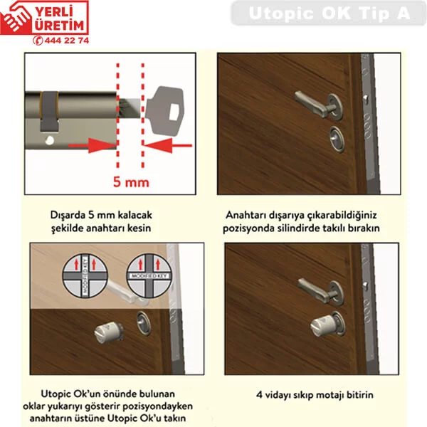 Desi Utopic Ok Tip A, Dünya çapında satılan bütün akıllı kilitlerden çok daha kolay ve hızlı montaj imkanı sunar. Yapmanız gereken tek şey anahtarınızı silindire takıp dışarıda 5 mm kalacak şekilde kesmeniz ve Utopic Ok akıllı kilidi anahtarınızın üstüne oturtup 2 adet vidasını sıkmak. Detaylı anlatım için lütfen altta bulunan çizimi inceleyiniz.